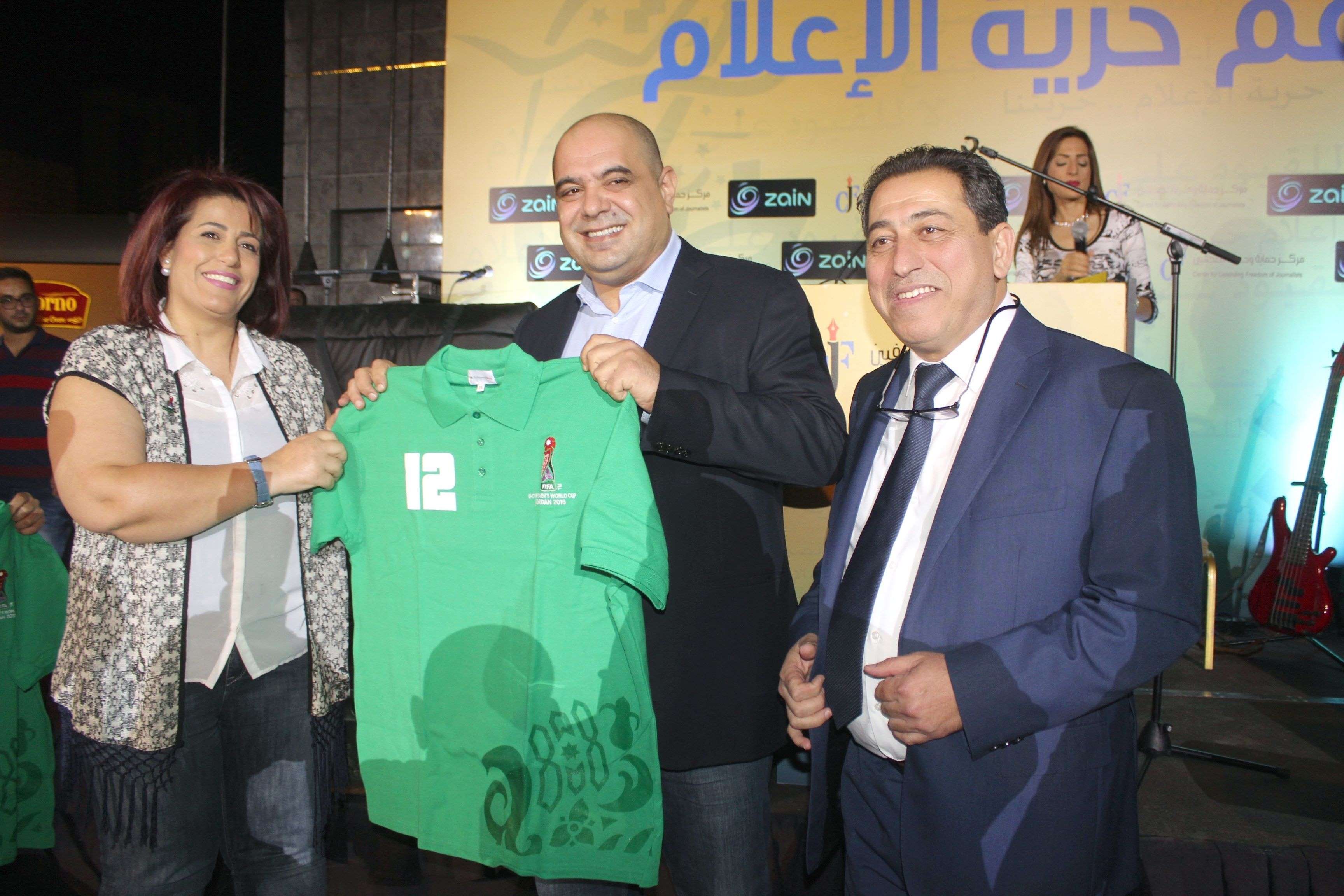 وبمناسبة استعداد الأردن لاستضافة كأس العالم للسيدات تحت سن 17 عاماً وإطلاق حملة “أنت اللاعب رقم 12” قامت المديرة الإعلامية للبطولة الصحفية هبة الصباغ ونيابة عن الاتحاد الأردني لكرة القدم بتكريم الرئيس التنفيذي لشركة زين أحمد الهناندة والرئيس التنفيذي لمركز حماية وحرية الصحفيين الزميل نضال منصور وتسليمهما “تيشيرت” الحملة.